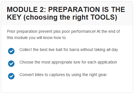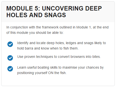Barra Basics is a 6 module, multimedia online training that teaches you how to start generating consistent catches from your barra fishing outings.