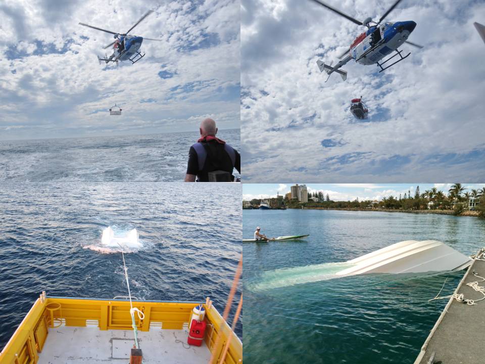 pants and a towel. 3 lovely gentlemen from Brisbane had taken Monday off to go fishing. On the way they were involved in an accident with a stolen car which was being pursued by the police so they nearly didn’t get to the boat ramp let alone rescue me. The Mooloolaba coast guard were contacted and took around 3 hours to reach us. I was then transferred to the 40’ coast guard vessel and after an hour or so they were able to right the powercat and commenced towing it to mooloolaba. Not long after we started the tow I suffered a heart attack and a helicopter was dispatched. The coast guard was advised to abandon the tow and proceed on course to Mooloolaba at speed. As soon as the boat slowed to let go the tow line the cat rolled over again! Meanwhile I was lying on the wheelhouse floor in pain.